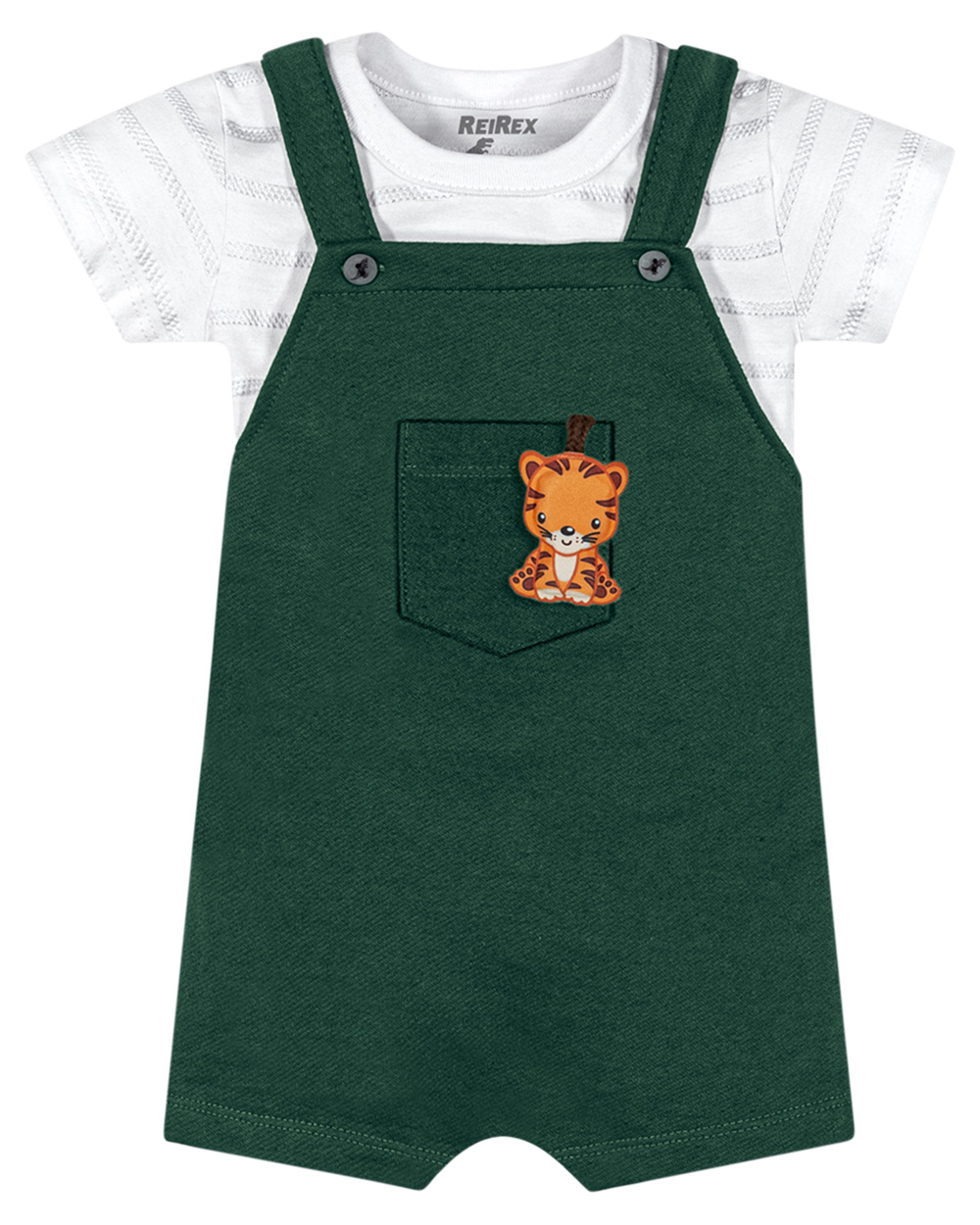 O Conjunto Bebê Masculino ReiRex é composto por duas peças. A Camiseta é confeccionada em meia malha 100% algodão, possui gola redonda, mangas curtas e estampa divertida. A Jardineira é confeccionada em moletinho flamê mesclado sustentável 84% algodão e 16% poliéster, possui alças com botão e bolsos frontal com aplique interativo.
